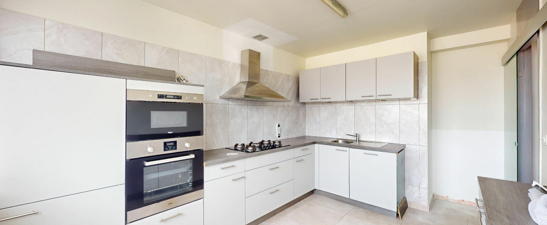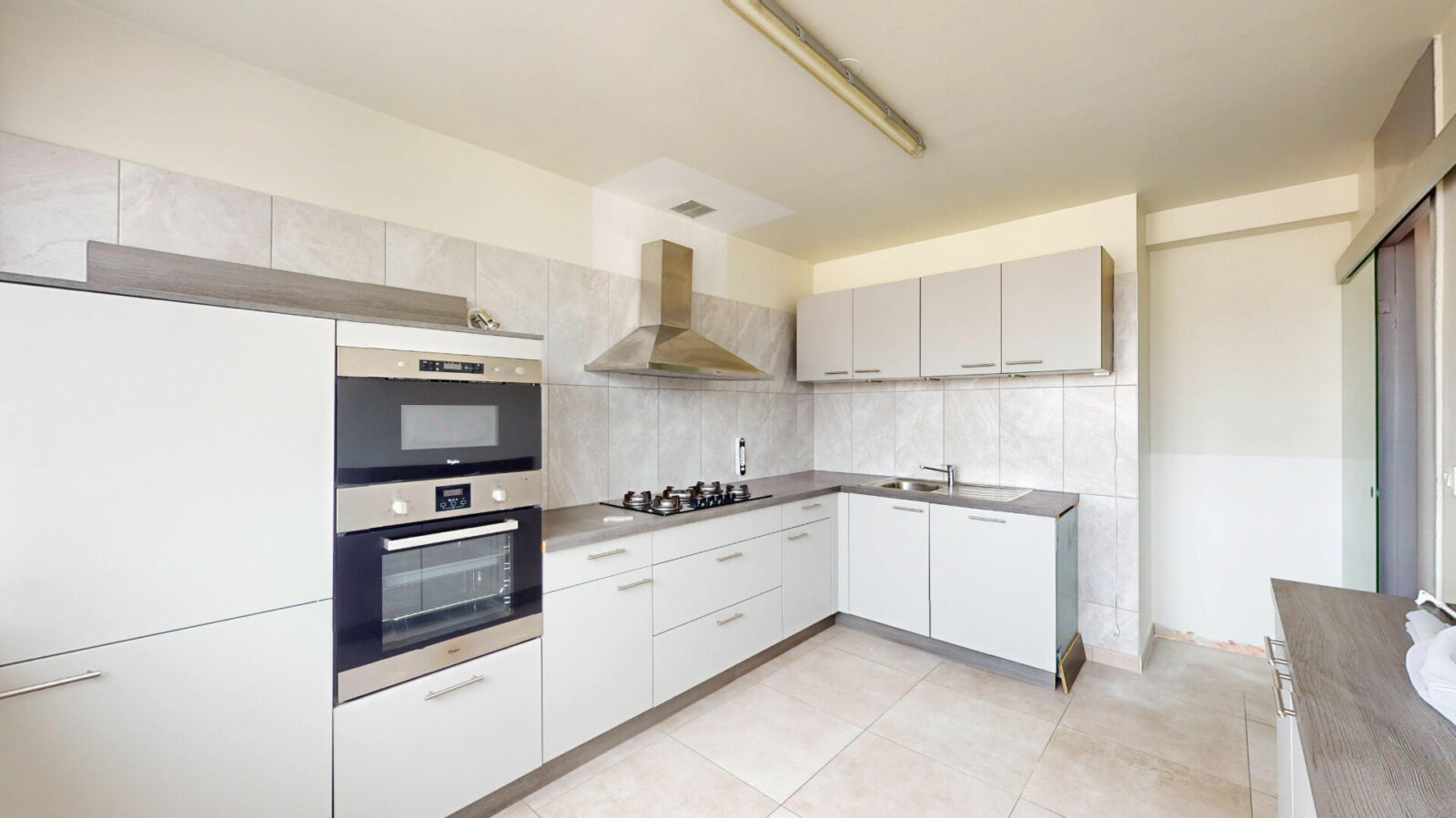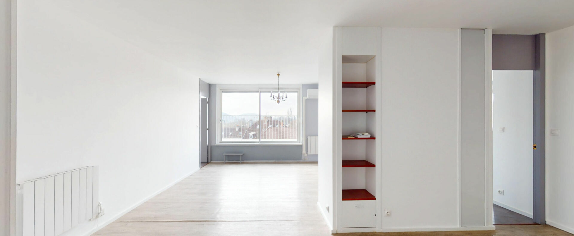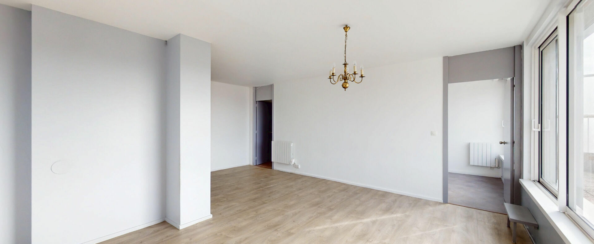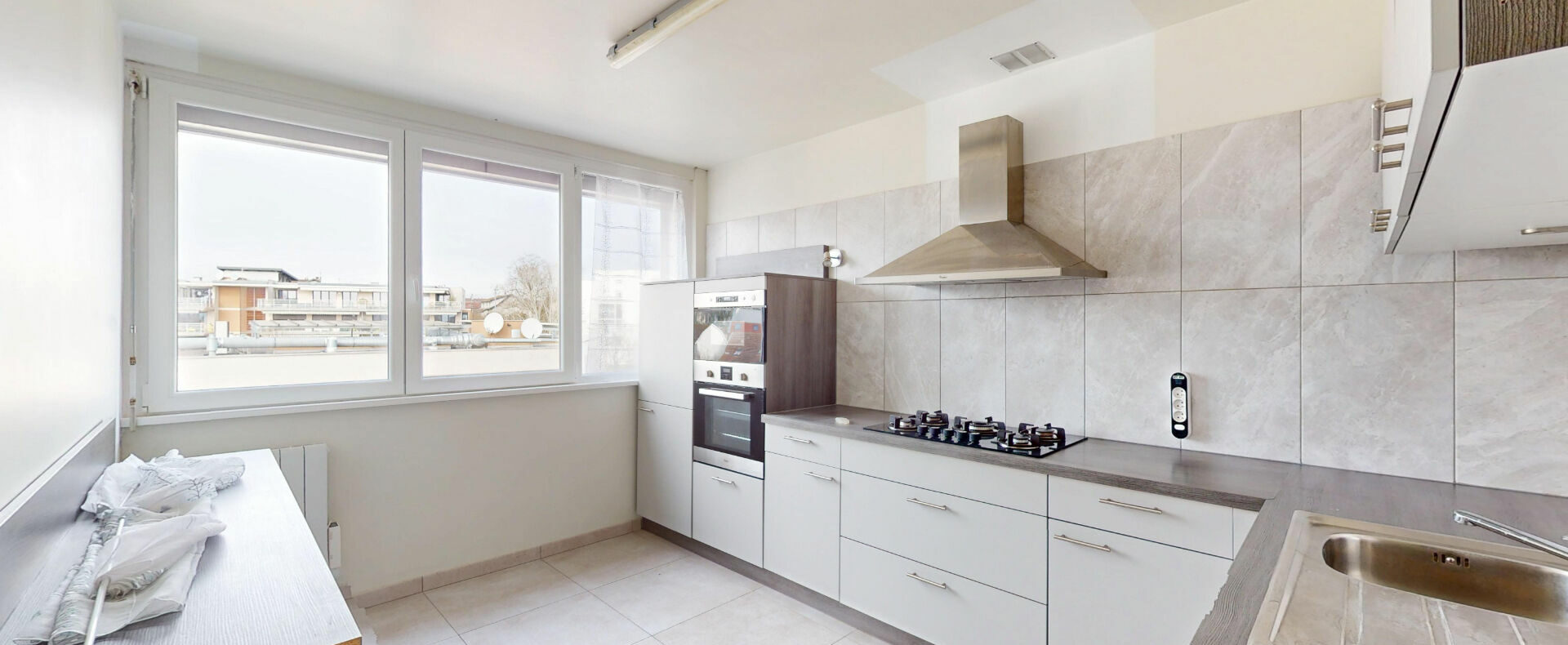 L’appartement comprend également une cuisine indépendante aménagée, trois chambres dont une avec accès direct au balcon, une salle de bain avec WC, une salle d’eau ainsi qu’un WC indépendant.