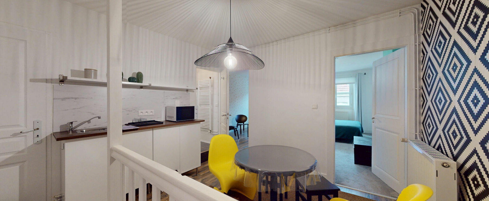 Le premier étage du duplex propose une mezzanine, deux chambres supplémentaires, une salle d’eau et un second W.C. Particularité rare : cet étage peut être entièrement indépendant, idéal pour une location saisonnière de type Airbnb. En effet, une kitchenette y a été installée et un accès autonome depuis le troisième étage de l’immeuble est déjà existant.